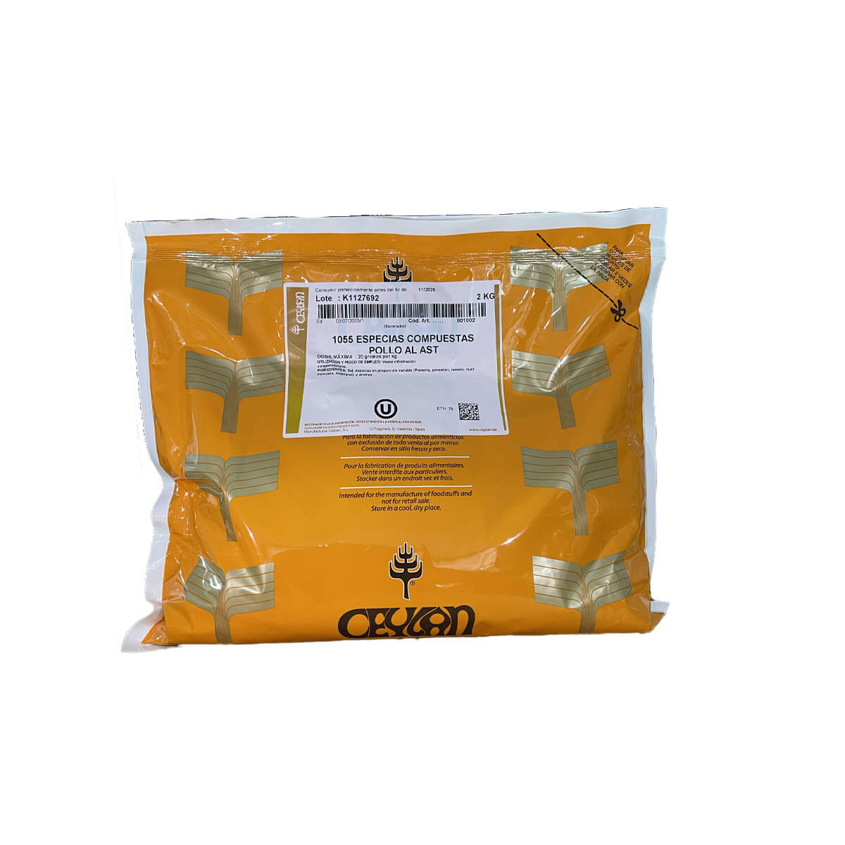 Sal 70,7%, especias en proporción variable 26% (pimienta negra, pimentón dulce, romero, nuez moscada, mejorana) y aromas naturales.3.3%.