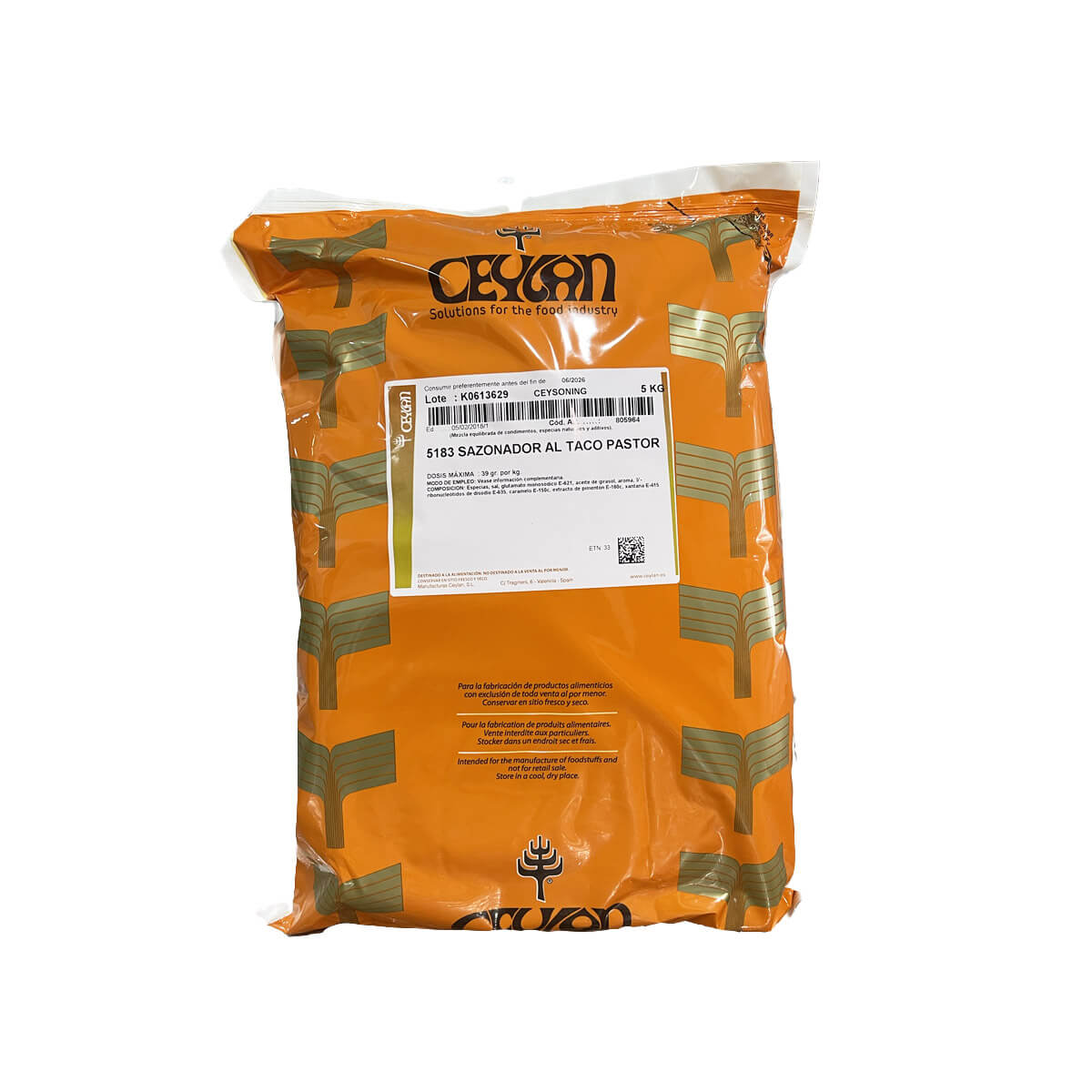 Especias, sal, glutamato monosódico E-621 (<=15.5%), aceite de girasol, aroma*, 5'- ribonucleótidos de disodio E-635 (<=1.3%), caramelo E-150c, extracto de pimentón E-160c, xantana E-415.